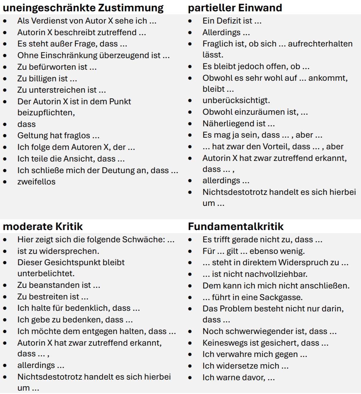 Einige Formulierungsvorschläge in der Diskussion von wissenschaftlicher Literatur finden sich in folgender Übersicht:
